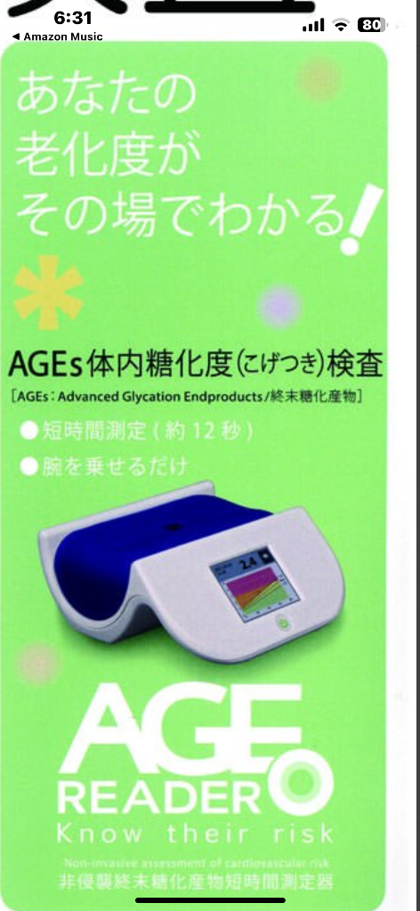 先日、『 AGEs 体内糖化度(こげつき)検査』をしたら。。。